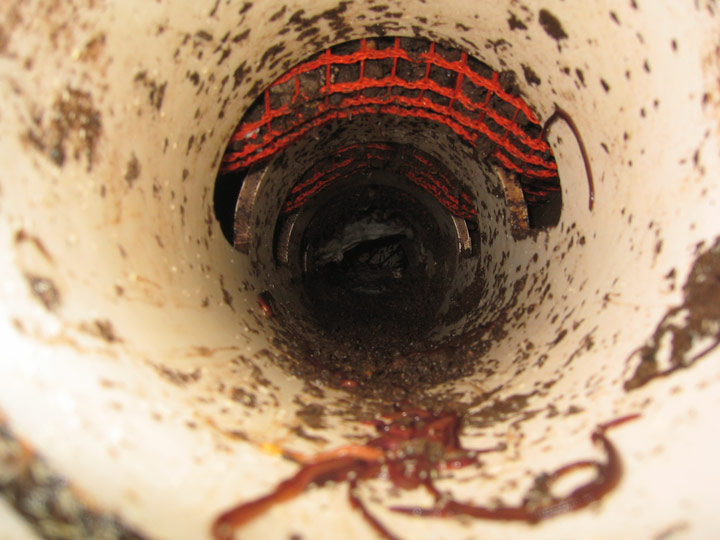 (red worms), electric fan, metal, plastic, pvc piping, tar, wood