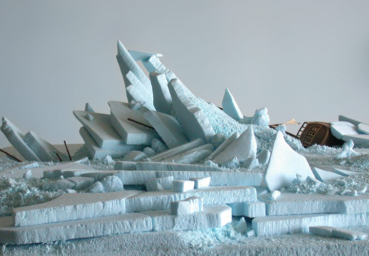 | | | | | | I used the 1823 painting titled "Sea of Ice(Arctic Shipwreck)" by Casper David Friedrich as a model and created a three dimensional replica of it in blue Styrofoam. In many ways this is a reversal of the painting process; translating a flattened image back into three dimensions required me to continually look at the painting and imagine the space described by the painting. | | R10.4 | 2002 | | colored paper, polystyrene | | 62" x 38" x 50" | | | | | | | | | | | | | |