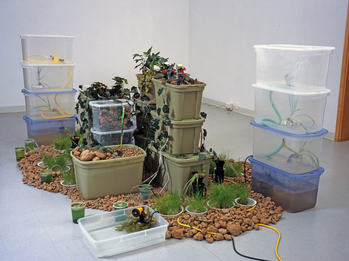 | | |  | | This is one of a series of recent works using cloned houseplants and bluegrass grown in ad-hoc hydroponic systems. These plants are interspersed among plastic plants, begging the question, ‘Which is more natural, a plant reproduced from a mechanical mold or from a genetic blueprint?’ | | T29.1 | 2005 | | water, pumps, organic and synthetic plants, paper pulp, video and electronic equipment, plastic bins | | 60" x 144" x 72" | | | | | | | | | | | | | |