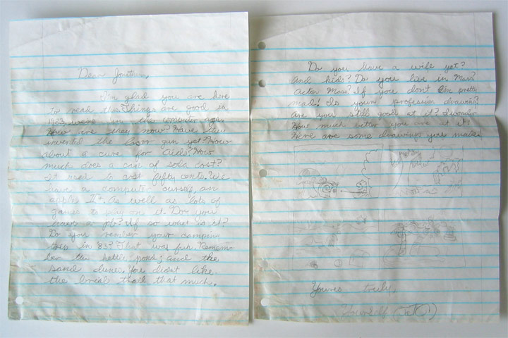 Dear Jonathan, I'm glad you are here to read this. Things are good in 1983, we're in the computer age. How are they now? Have they invented the laser gun yet? How about a cure for Aids? How much does a can of soda cost? It used too cost fifty cents. We have a computer ourself, an Apple II+. As well as lots of games to play on it. do you have a job? If so what is it? Do you remember your camping trip in '83? That was fun. Remember the ketle pond; and the sand dunes. You didn't like the brail trail that much. Do you have a wife yet? And kids? do you live in Mass? Acton Mass? If you don't I'm pretty mad! Is your profession drawing? Are you still good at it? I wonder how much better you are at it? Here are soome drawings you made. Youres truly, Yourself
