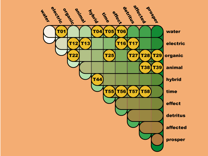 | | |  | chart showing the meaning behind the T# numbering system. Each digit (0 - 9) is connected to a theme. Each two digit T number is an intersection of two themes. The lower digit appears always appears first, so that there are no repeats. | | T56.070321 | March 21, 2007 | | digital image | | | | | | | | | | | | | | |