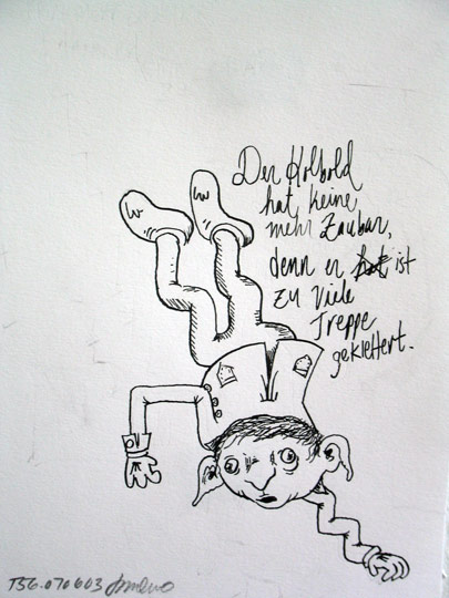 | | | | | T56.070601 - T56.070630 were made during a month in Berlin. They are not related to any other projects from 2007, but more closely resemble images from the dreamstrips (R1.1.850 etc.) This piece was adapted one month later: T56.070703 and two months later: T56.070803 | | T56.070603 | June 2007 | | ink and watercolor on paper | | 8" x 6" | | | | | | | | | | | | | |