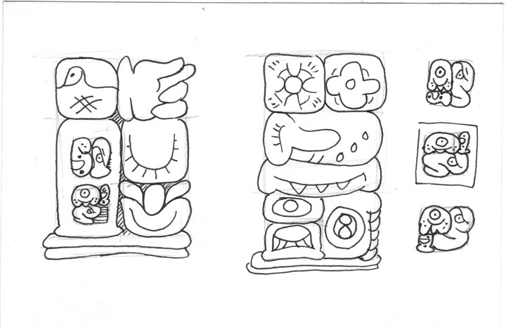 experiments with glyph forms. Blocks representing sentences. Small block on right-- experiments with syllabic glyph arrangements of word [mo-li-sa]