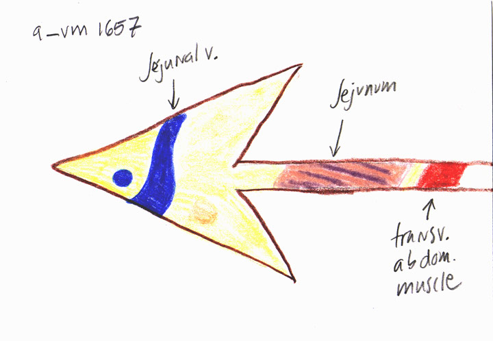 Arrow to navel.